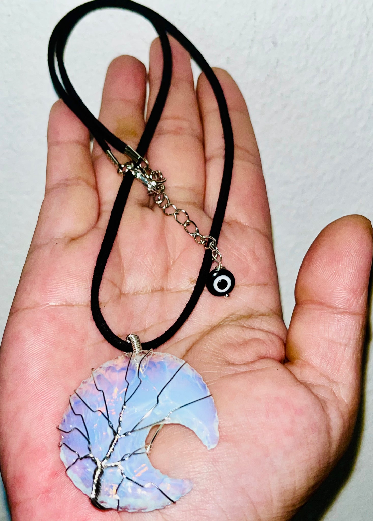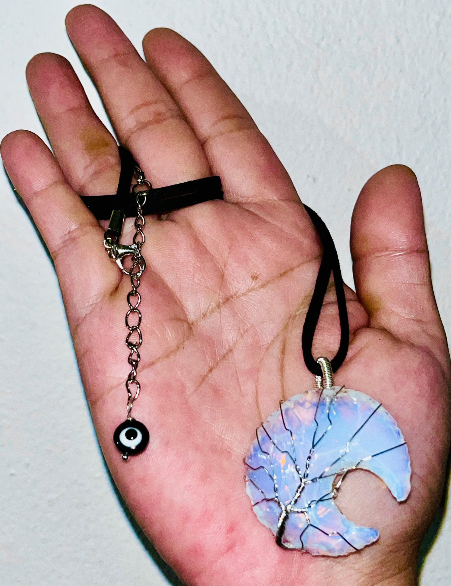This Peruvian Opalite Tree of Life pendant is believed to bring peace, clarity, and protection to its wearer. The adjustable cord is adorned with an evil eye symbol, known for its power to ward off negative energy. Let this Sacred Opalite Moon Pendant be your daily amulet for a balanced and protected life.