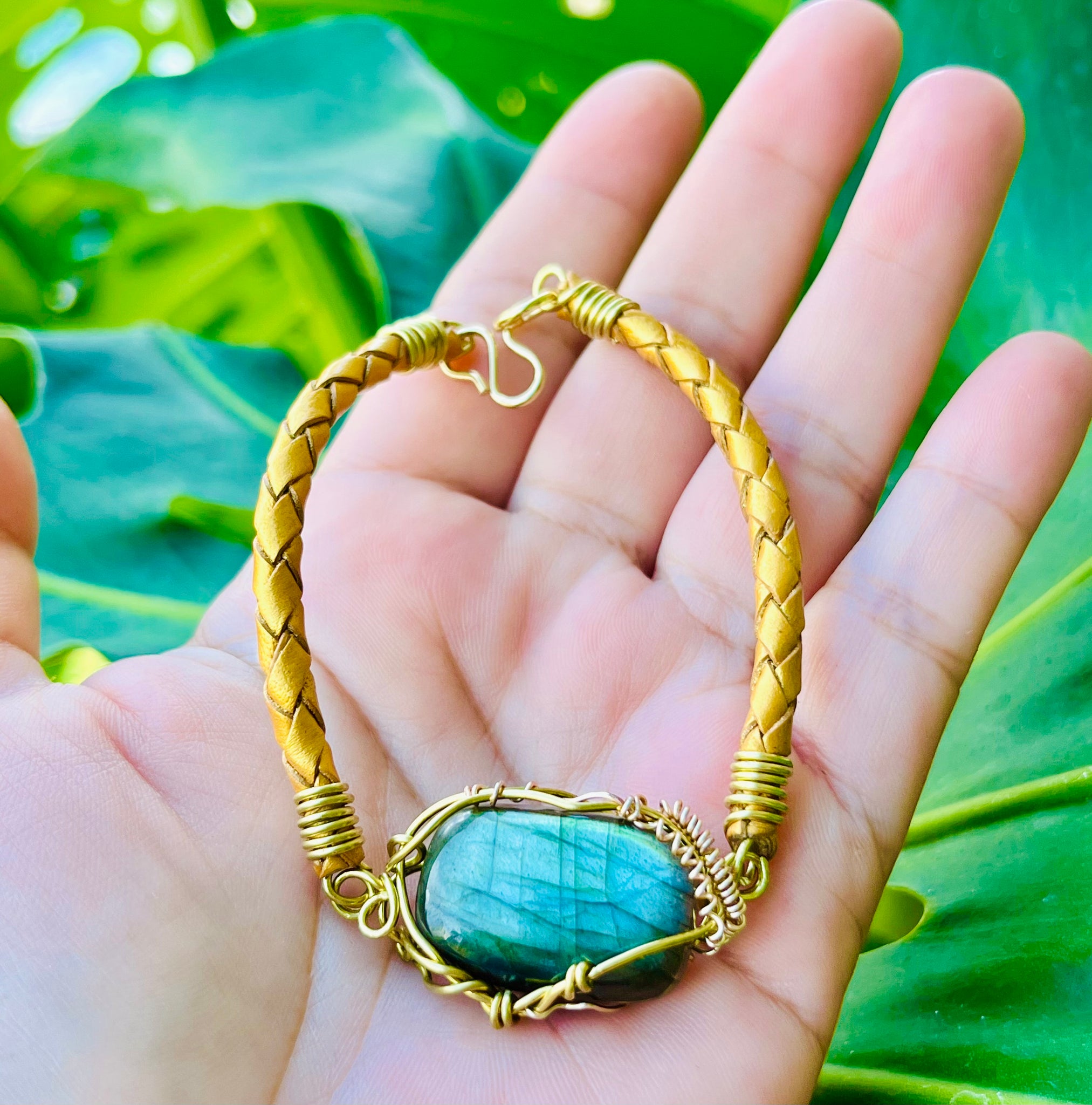 Elevate your everyday look with this handcrafted leather bracelet, featuring a stunning blue labradorite cabochon wrapped in warm brass wire. Each bracelet is carefully made by hand using genuine leather and finished with solid brass hardware, blending rustic charm with timeless elegance.