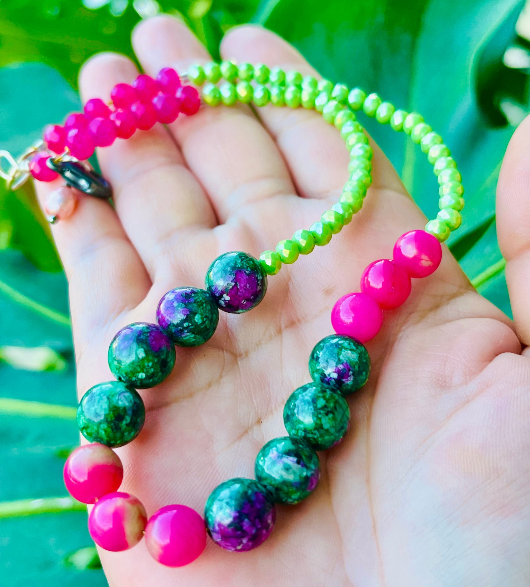 Experience the beauty and energy of nature with our Watermelon Jasper Choker. Handmade with green epidote Jasper, naturally dyed pink jade, and crystals, this beaded choker is a stunning addition to any outfit. Its medium/large size (8") makes it a versatile and unique accessory.