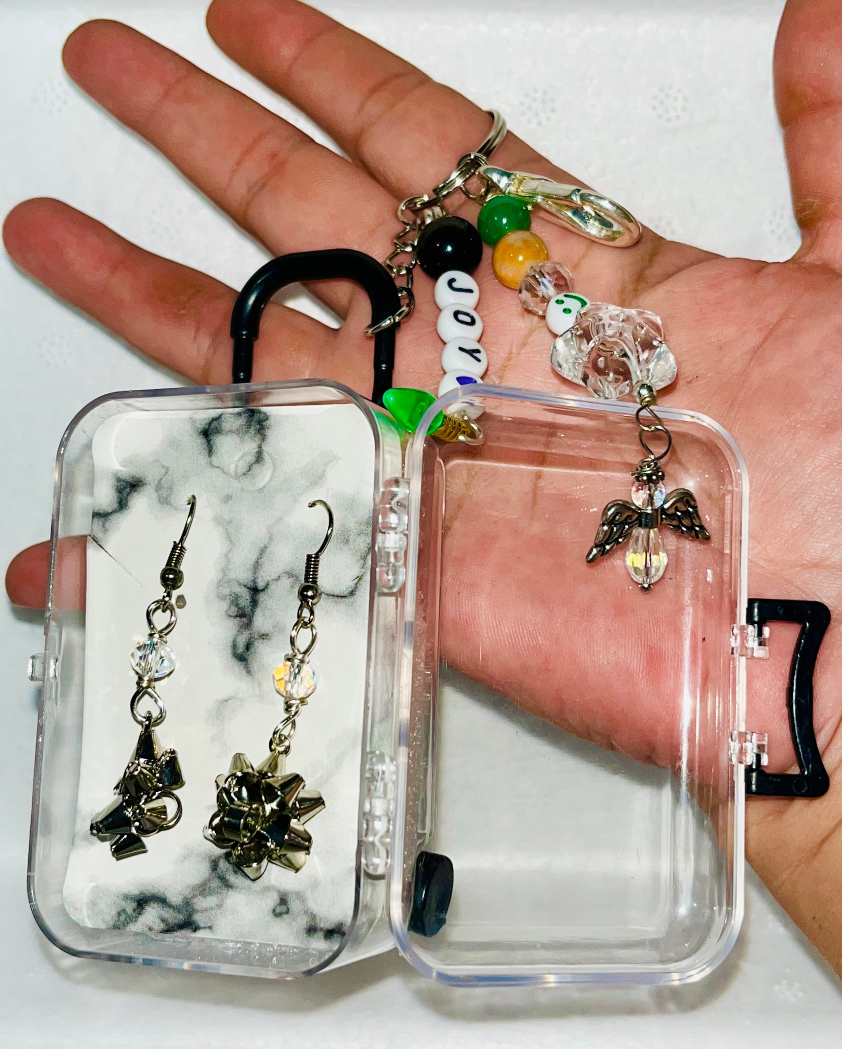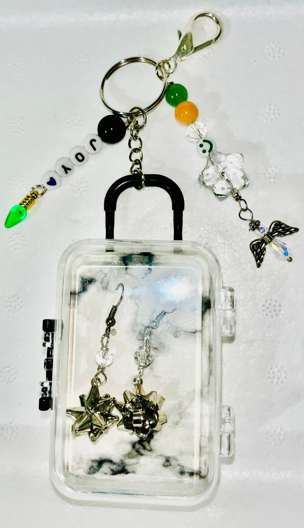 Crafted with festive cheer, this X-MAS Jewelry Box Charm is a must-have for the holiday season. The gorgeous agates and gemstones, along with the adorable mini jewelry luggage, make it a charming accessory. As a bonus, it also comes with Christmas earrings and a keyring for convenience. Perfect for adding some holiday spirit to your purse or as a portable jewelry case.