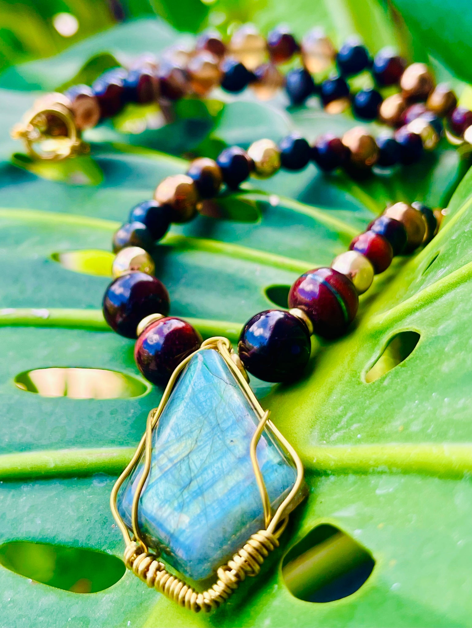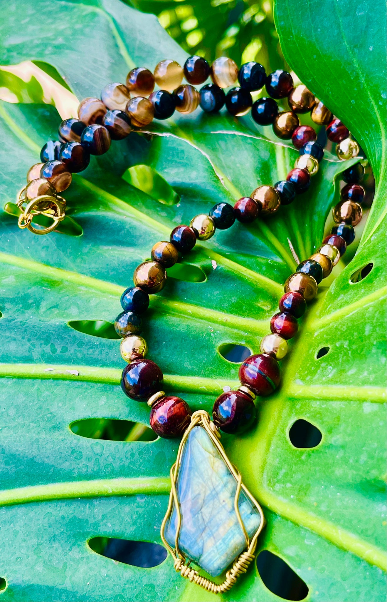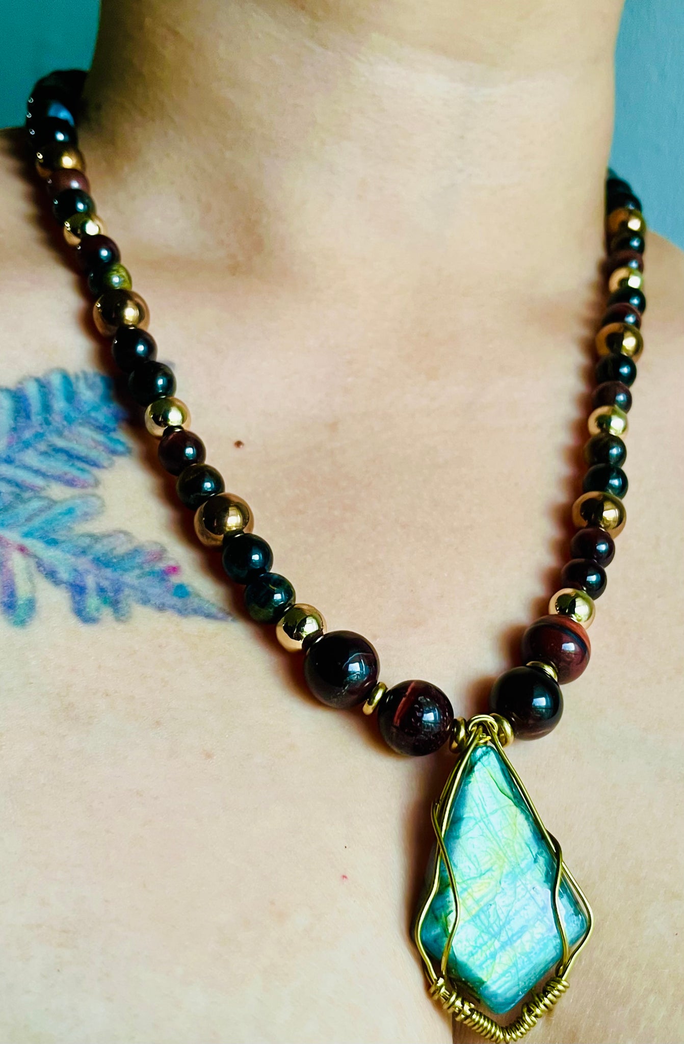 Expertly handcrafted, this Multi-Tigerseye, Hematite, Onyx, and Labradorite Necklace will elevate any outfit. The stunning combination of red, gold, and blue Tigerseye, paired with hematite, creates a one-of-a-kind piece. With a brass flashy labradorite pendant, this necklace is perfect for adding a touch of elegance and sophistication.