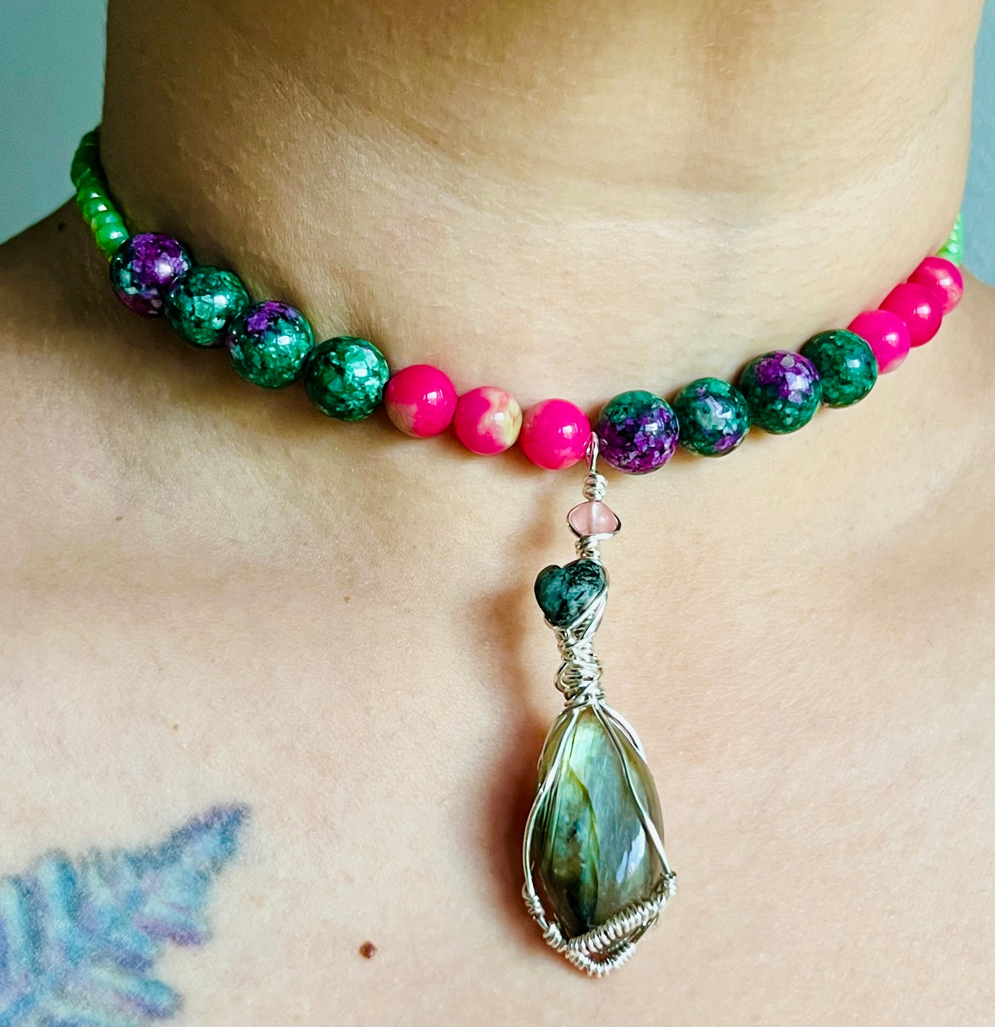 Experience the beauty and energy of nature with our Watermelon Jasper Choker. Handmade with green epidote Jasper, naturally dyed pink jade, and crystals, this beaded choker is a stunning addition to any outfit. Its medium/large size (8") makes it a versatile and unique accessory.