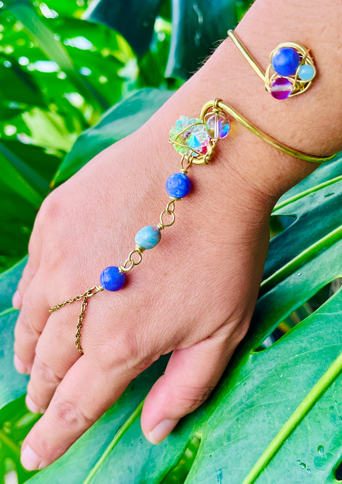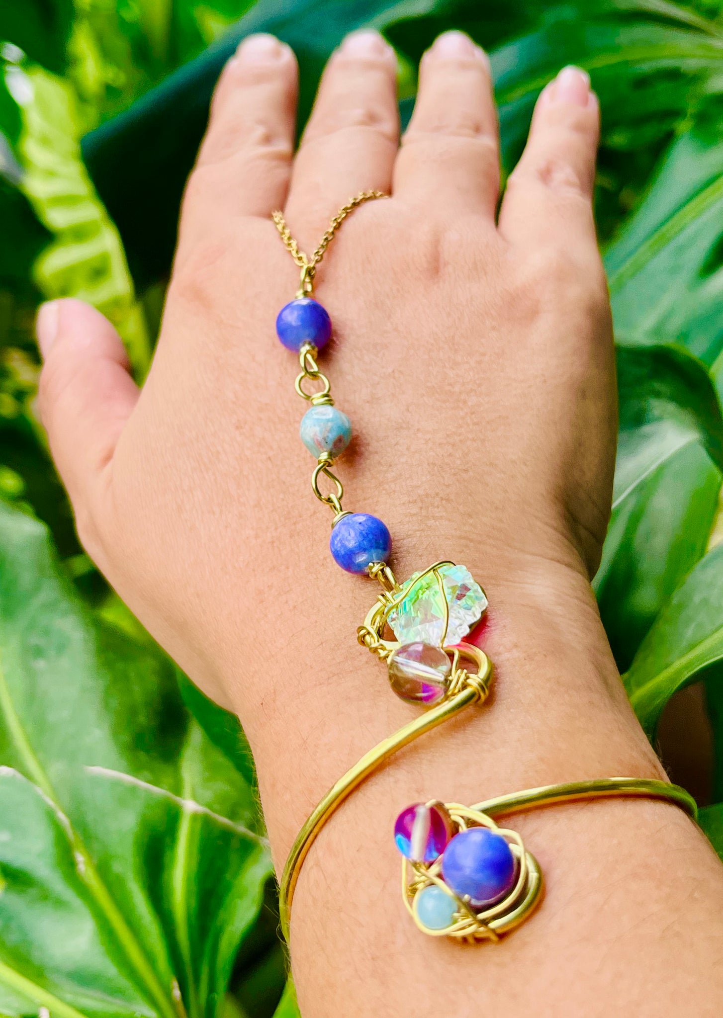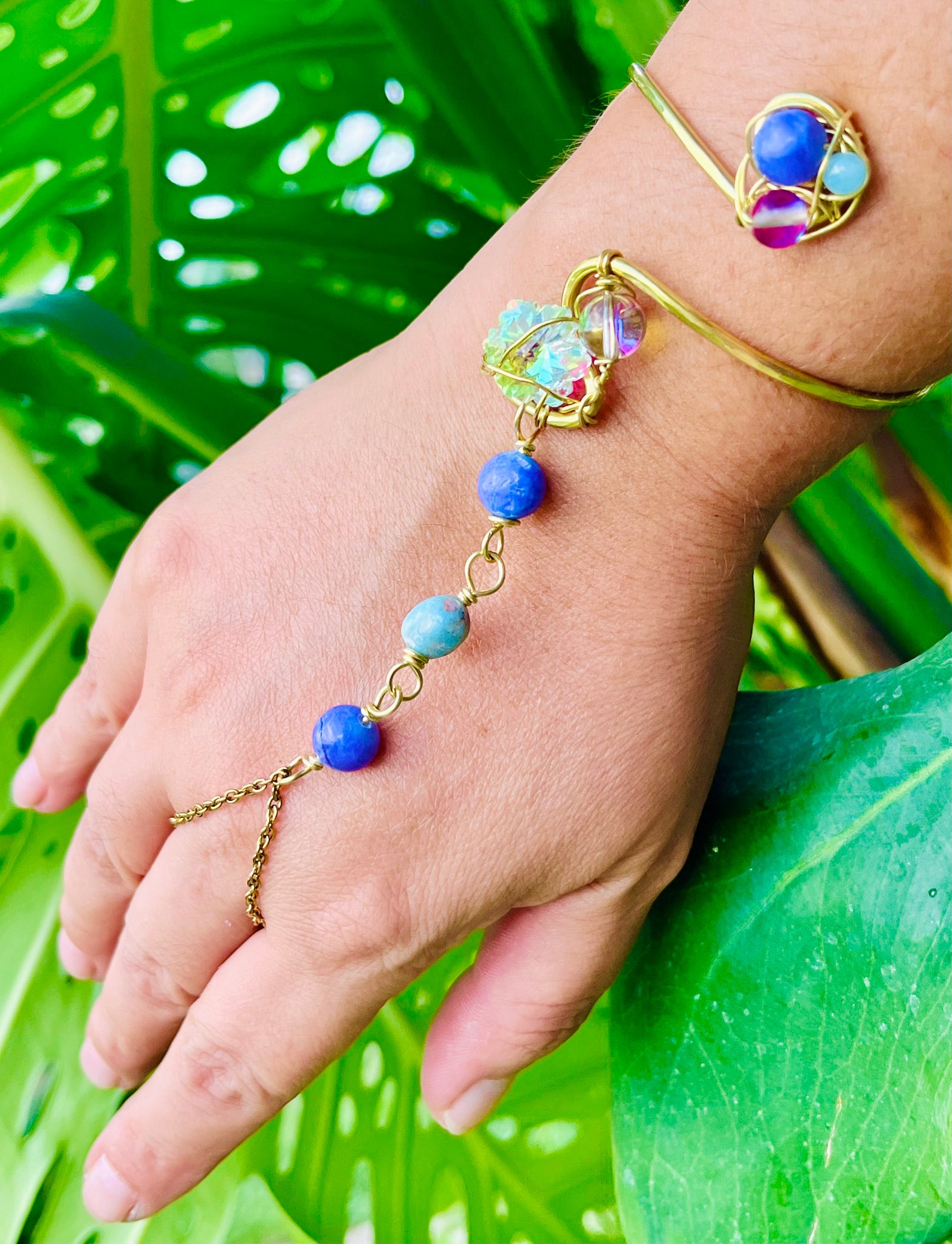This elegant Chalcedony Larimar Brass Panja features a stunning combination of purple and blue chalcedony, adorned with larimar. With its intricate design and high-quality materials, it is sure to add a touch of sophistication to any outfit. Perfect for those seeking a unique and stylish accessory.