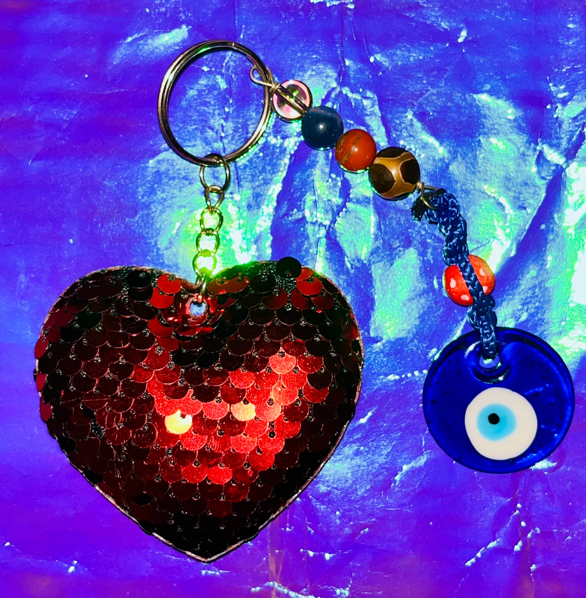 This plushy red heart keychain features an evil Turkish eye protector and agates that add a touch of protection to your daily essentials. Keep your keys or purse safe and stylish with this unique keychain.