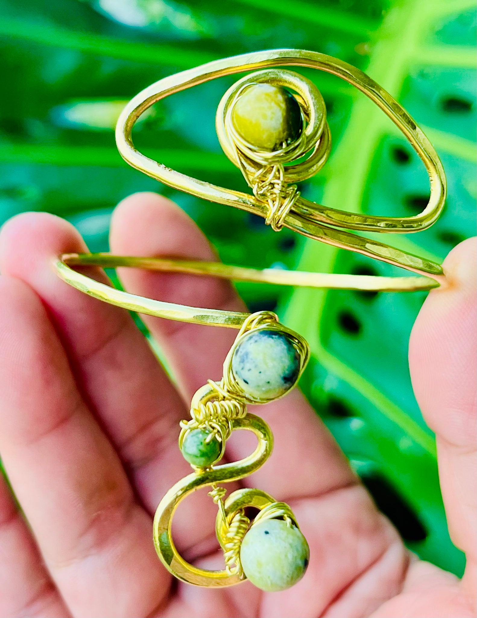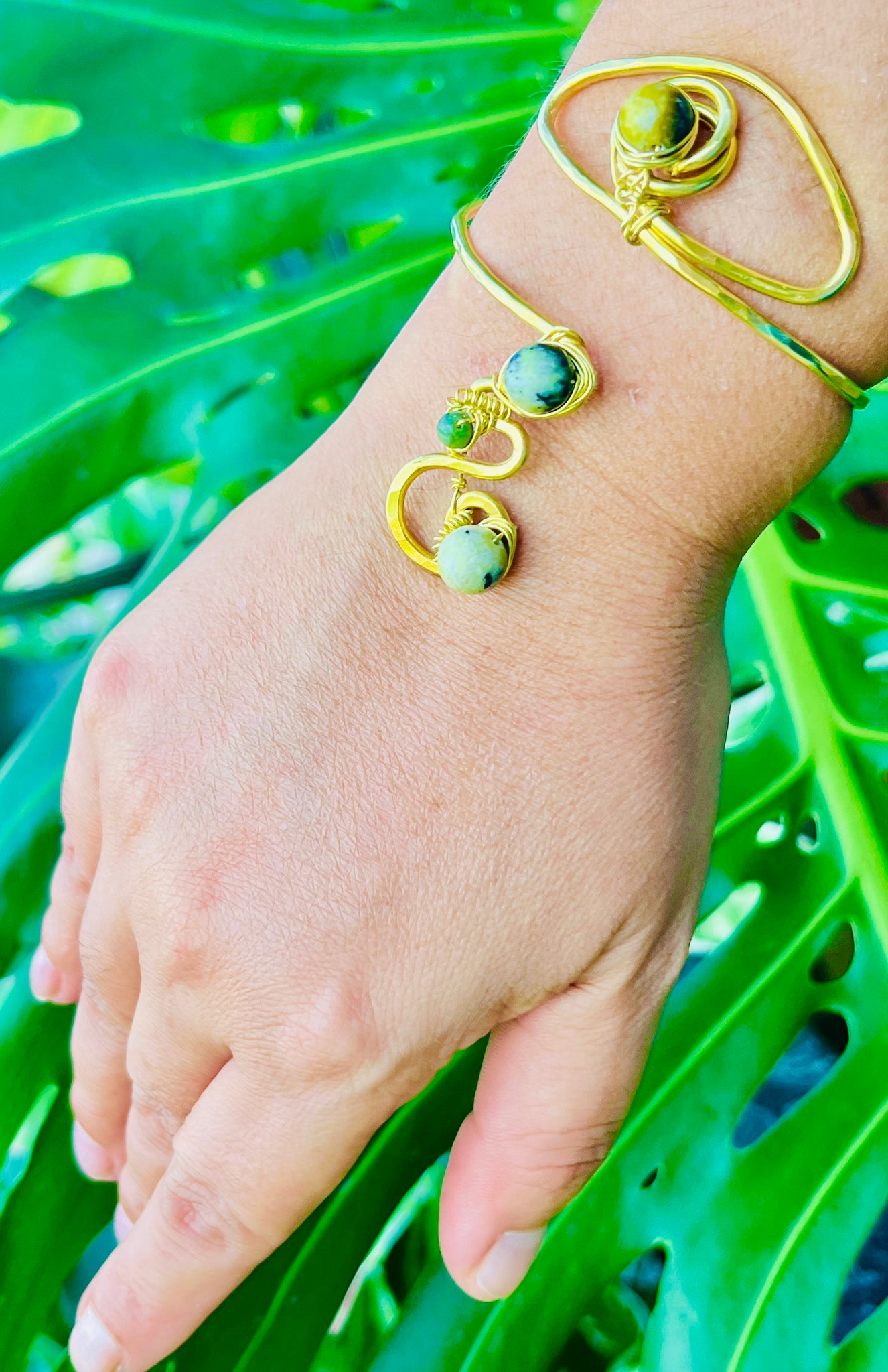 Experience the healing powers of our Eternal Eye Yellow Turquoise Cuff. Hand texturized brass encases the sacred protective eye, decorated with lemongrass yellow turquoise. Adjustable to fit all sizes. Discover the natural benefits of this powerful combination and add it to your collection today.