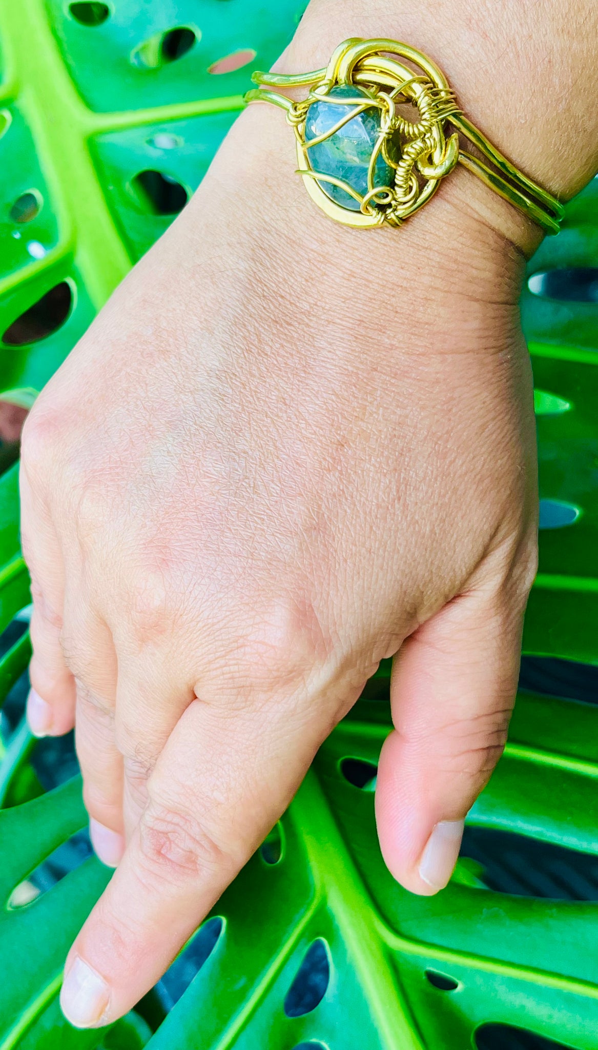 Expertly handcrafted from brass, this stunning cuff bracelet features a unique and texturized design. Adorned with a beautiful wire-wrapped labradorite, this piece is not only stylish but also adjustable to fit sizes s/m. Add a touch of elegance and versatility to your wardrobe with this one-of-a-kind bracelet.