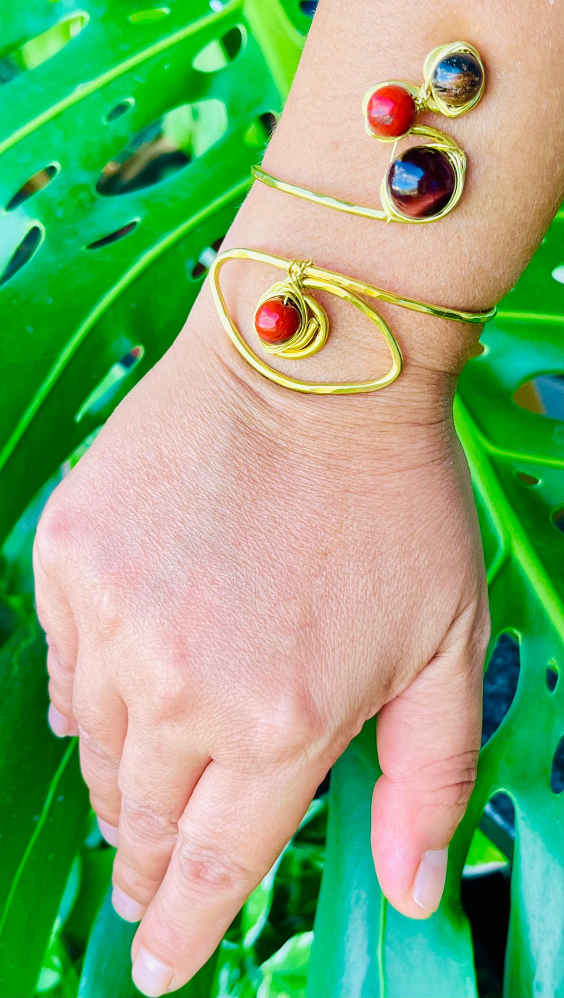 Experience the healing powers of our Eternal Eye Jasper Brass Cuff. Hand texturized brass encases the sacred protective eye, decorated with Red Jasper and red Tigerseye. Adjustable to fit all sizes. Discover the natural benefits of this powerful combination and add it to your collection today.