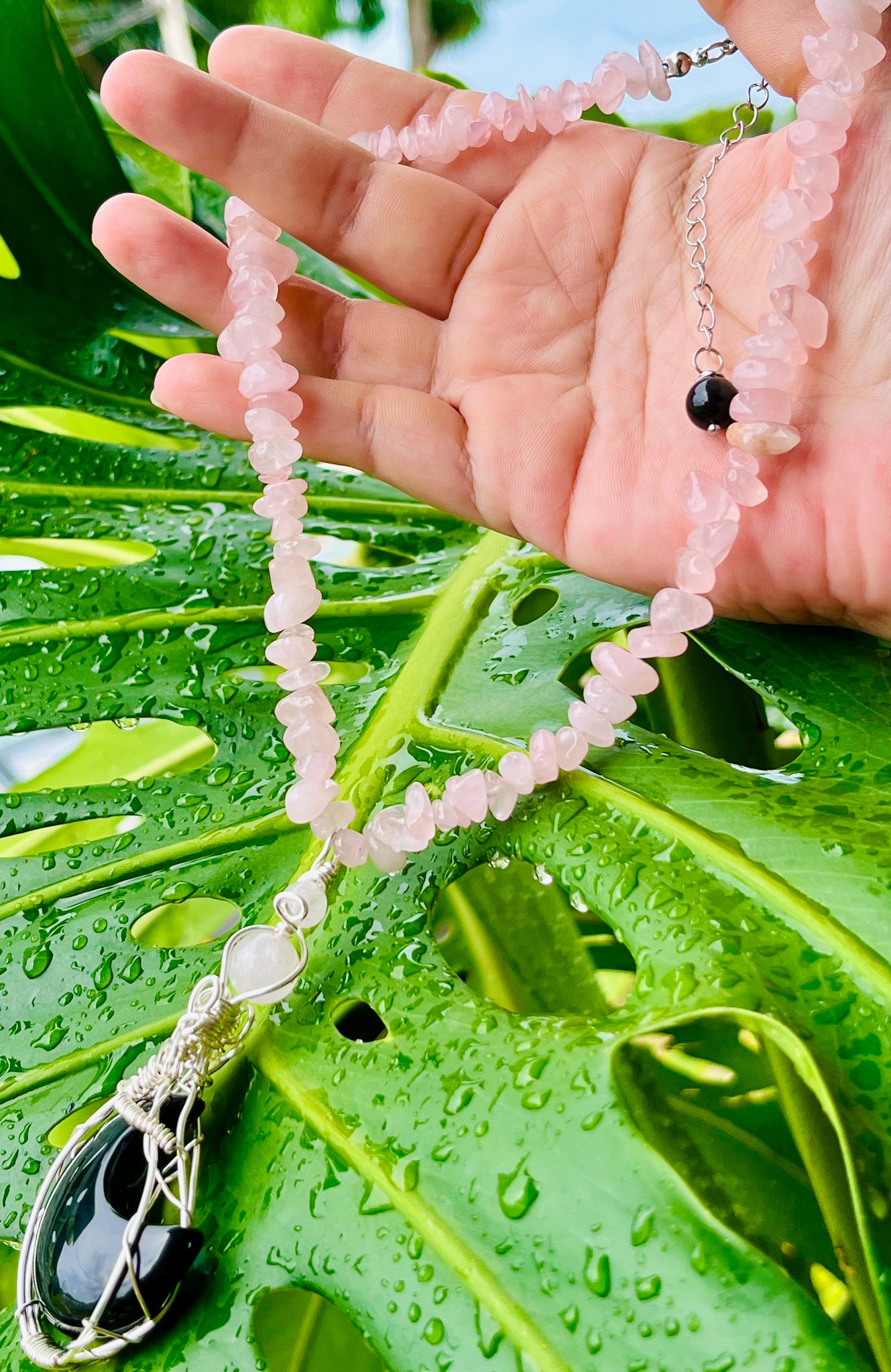 Obsidian Moon Rose Quartz Adjustable Necklace