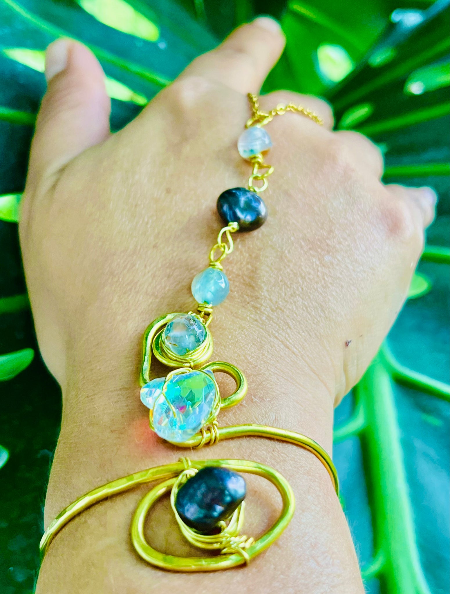 Protective Pearl Brass Panja is a handcrafted ring bracelet with wrapped fresh water pearls, aquamarine, and crystals on a textured adjustable brass cuff. The combination of these materials offers a unique and stylish look while also providing protection and promoting inner peace. A must-have for any fashion-forward individual.