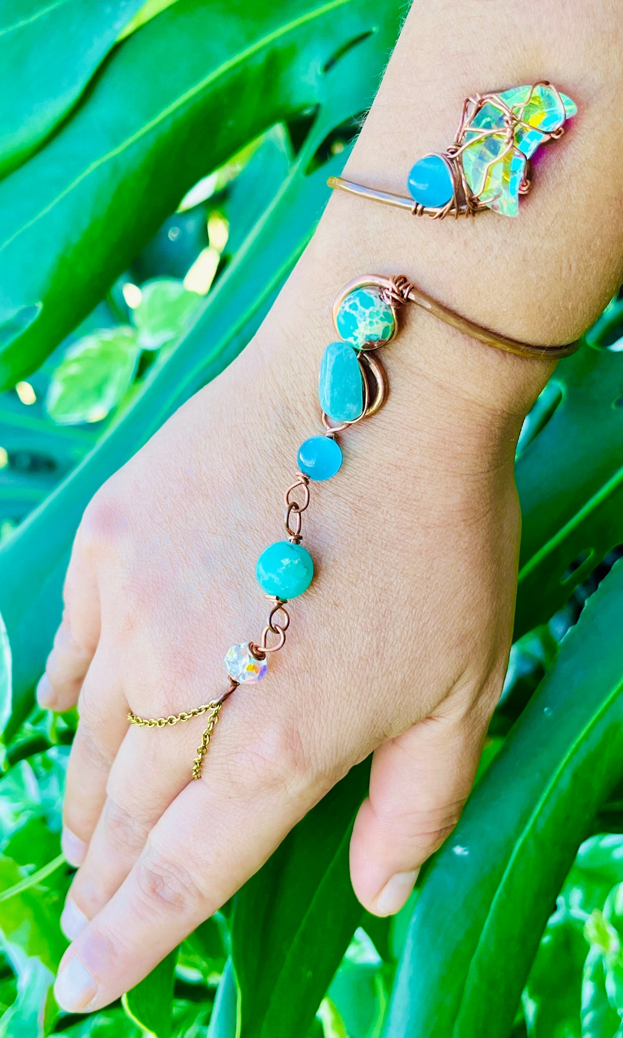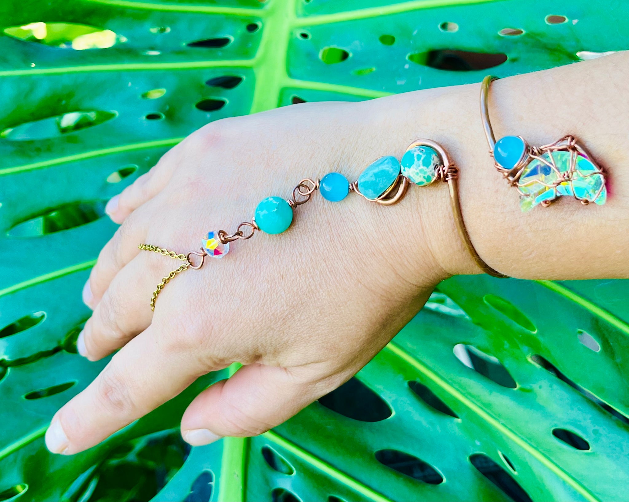 Experience the natural healing energy of Sea Jasper and Amazonite with our handcrafted copper Panja bracelet. The addition of cats eye and a shimmery moon crystal add an extra touch of beauty and mystique to this adjustable ring bracelet. Embrace the power and connection to nature with this unique piece.